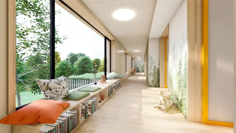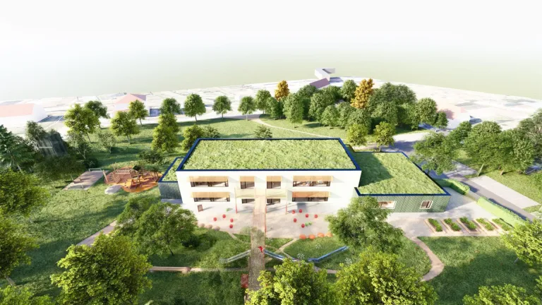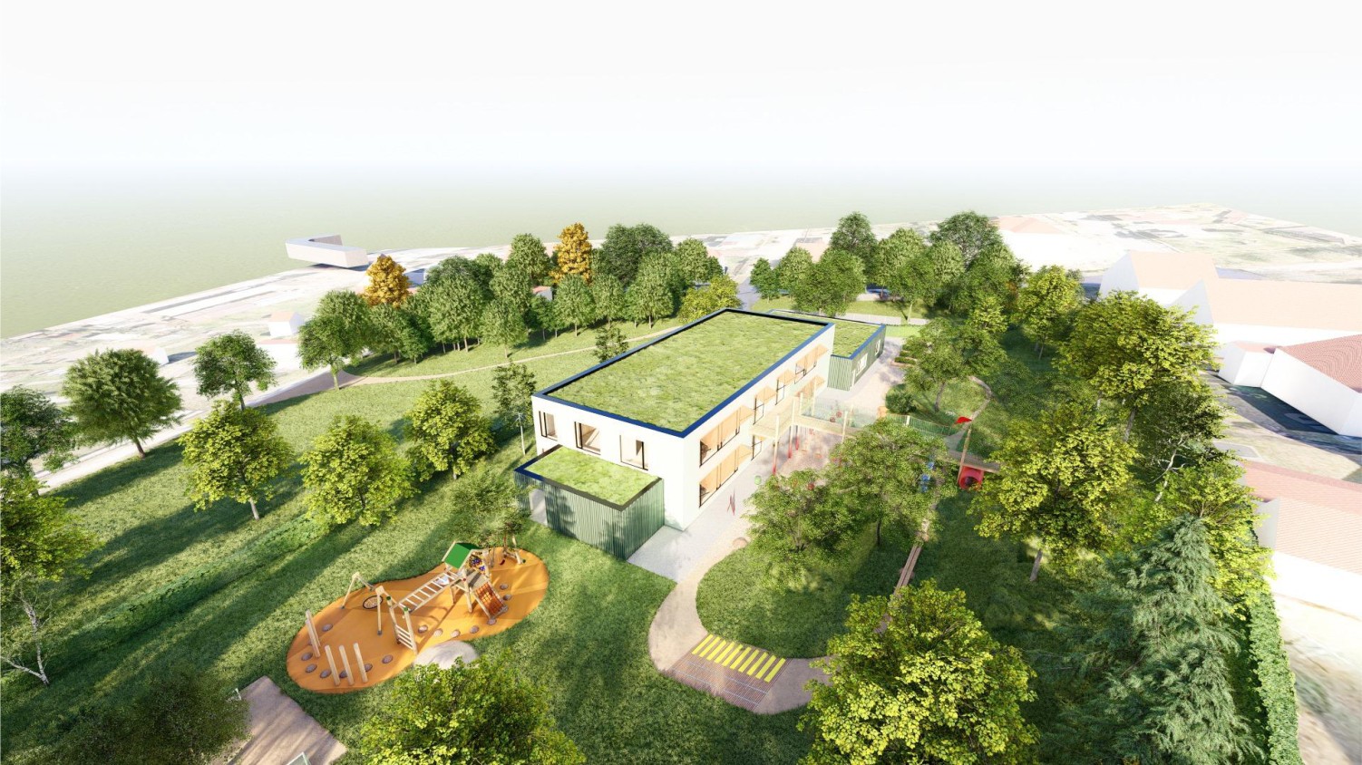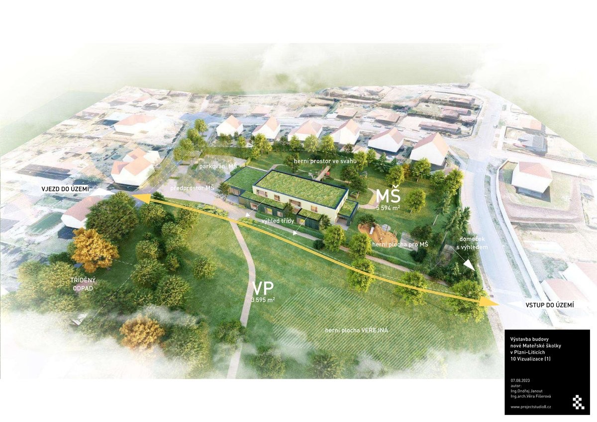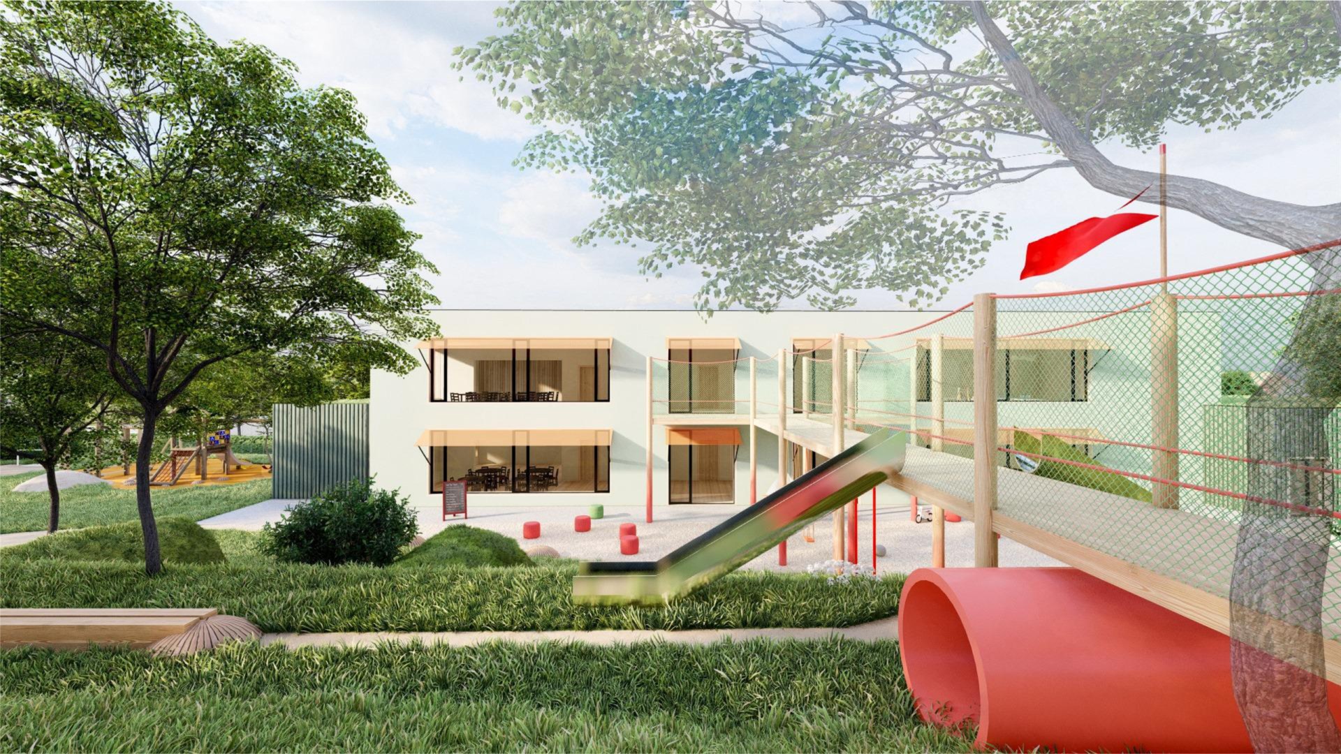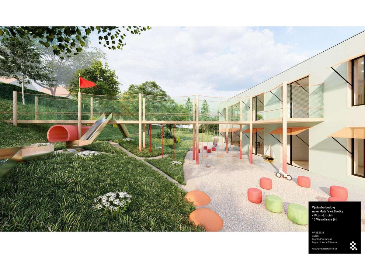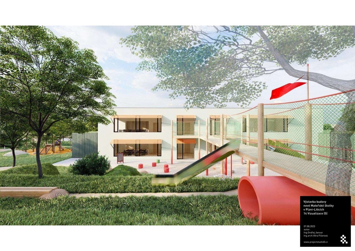 Dvoupodlažní budova mateřské školy, která nahradí stávající nevyhovující objekt, kombinuje klasickou omítku s dřevěným obkladem a je osazena vegetačními střechami, které pomohou zadržovat dešťovou vodu a přirozeně ochlazovat klima v areálu. Projekt počítá s vlastní kuchyní, jídelnou a zahradou s herními prvky, na kterou budou mít děti z přízemí přímý přístup. Zhotovitelem stavby je firma ROADFIN STAVBY s.r.o. a autorem projektu projectstudio8.