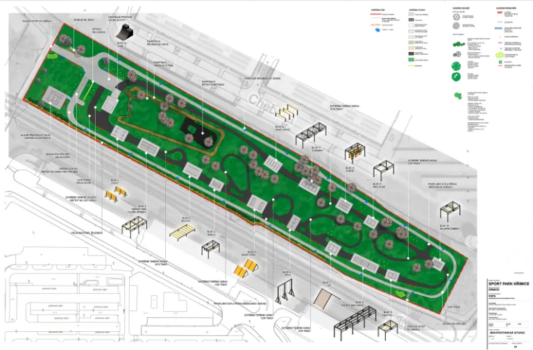 Celý prostor určený pro sport zachovává terén a ráz krajiny v co největším rozsahu, aby sportovci mohli využívat jednodušší i extrémní terénní trasy, doplněné přírodními překážkami, jakými jsou třeba svah, valy či kameny. V areálu je navrženo veřejné osvětlení podél trasy pro běh. Počítá se také s mobiliářem – samoobslužné skříňky pro úschovu osobních věcí, kolostavy a lavičky, dále pak hygienické zařízení nebo mobilní WC boxy.