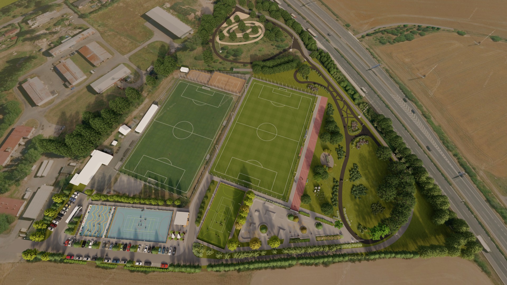 Součástí projektu je vybudování nového fotbalového hřiště s umělým trávníkem třetí generace, který má certifikaci Fotbalové asociace ČR. Hřiště bude mít rozměry 68 × 108 metrů (celková plocha 7 344 m²) a bude vybaveno zavlažováním i osvětlením.
