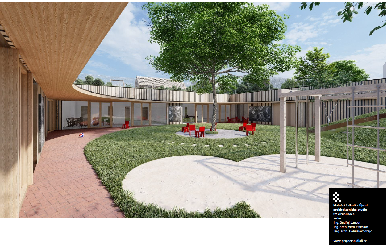 Kromě běžných místností a zázemí nebudou chybět ani prvky pro hru dětí jako pískoviště, prolézačky, plácek pro míčové hry nebo skluzavka, která propojuje horní a dolní zahradu. Součástí školky jsou i prostory dvou zájmových učeben, které budou sloužit v odpoledních a večerních hodinách pro pořádání kroužků a jiných volnočasových aktivit obyvatel Újezda.