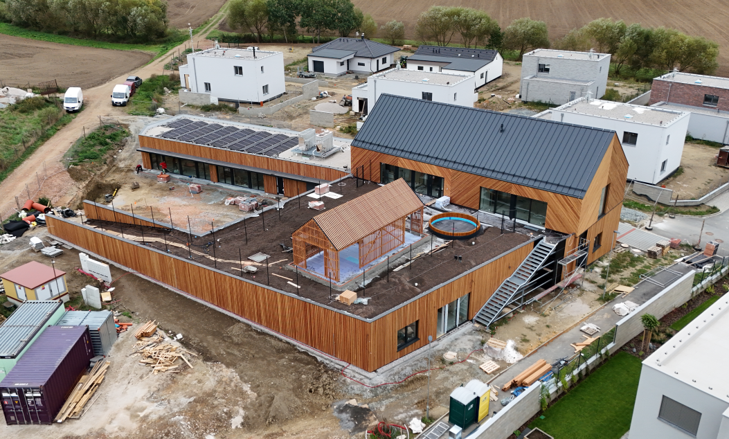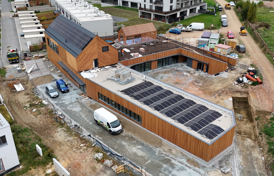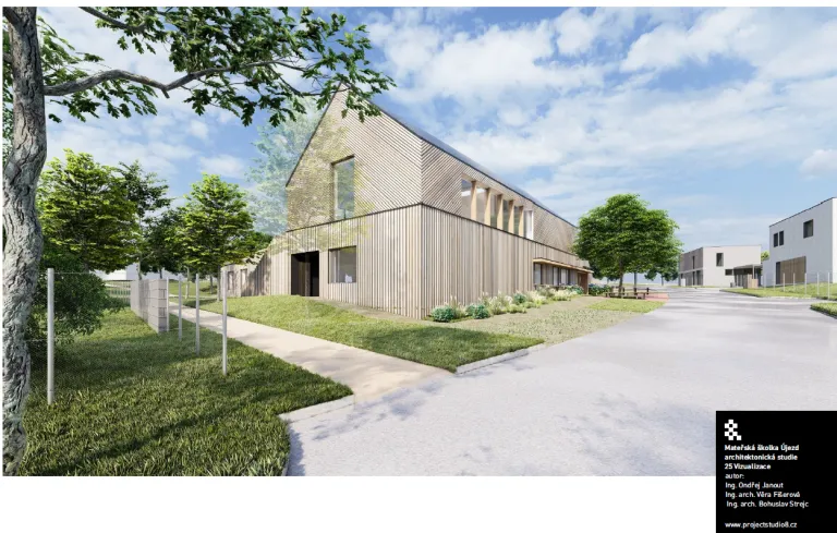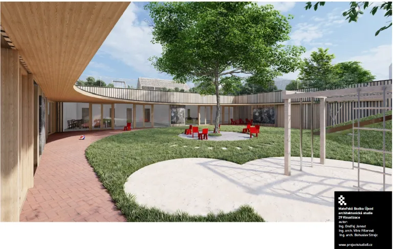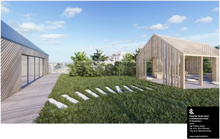 Architektonická kancelář projectstudio8 navrhla budovu mateřinky z velké části jako jednopodlažní se zelenými střechami a částečně uzavřeným dvorkem pro hraní. V přízemí budou dvě třídy pro mladší děti, ve 2. podlaží třída pro starší děti a předškoláky. Střešní pobytová zahrada bude sloužit hlavně starším dětem a díky altánku budou moct některé aktivity přesunout přes léto ven.